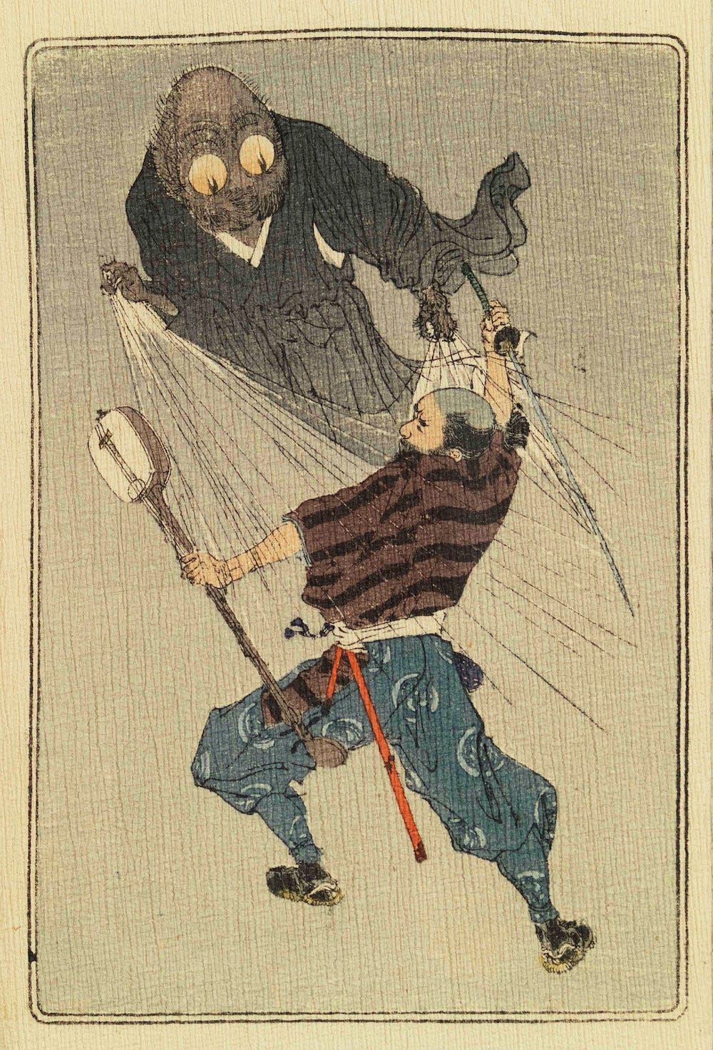 here’s a gratuitous public-domain picture from a Japanese fairytale of a handsome fella fighting a big-eyed goblin with a sword and a lute